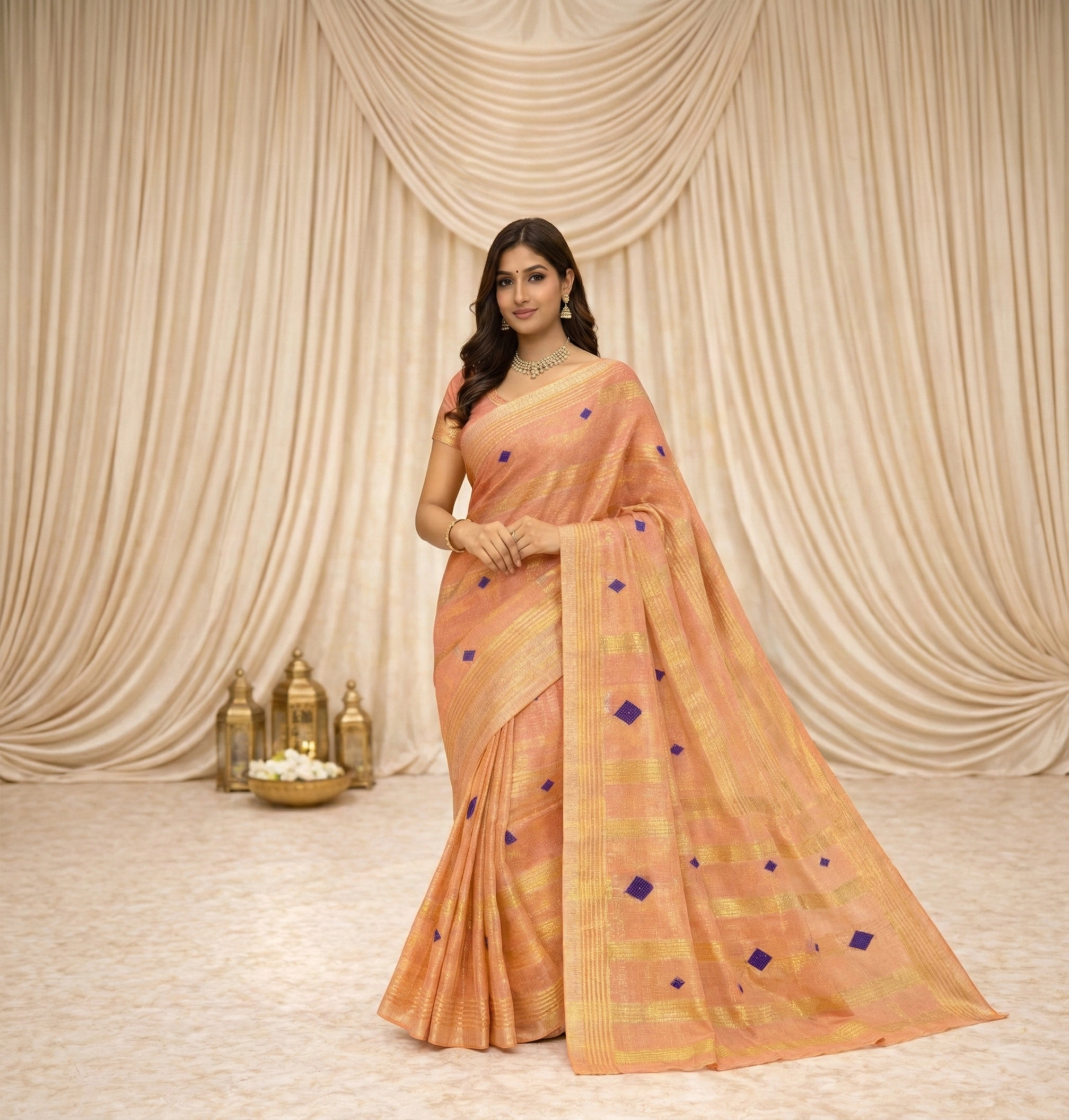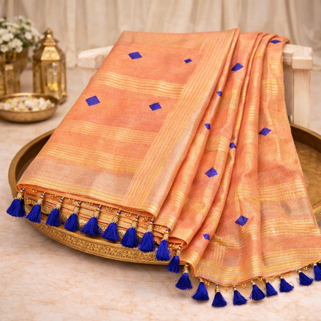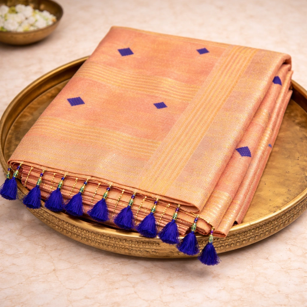 The peach blush base flatters Indian skin tones beautifully. The horizontal golden tissue stripes add structure and richness. Meanwhile, small royal blue woven motifs across the body and pallu bring contrast and personality. The tassel detailing at the edge completes the festive aesthetic with gentle movement.