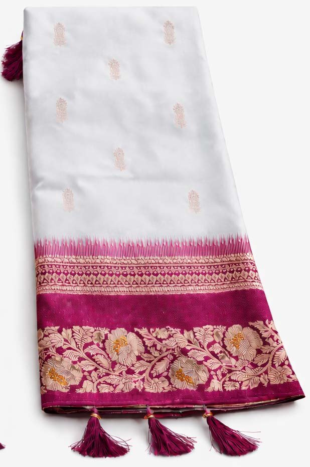 Designed for women who love rich contrasts with regal detailing, the Kumudini Rani Satin Silk Saree creates a powerful yet elegant presence. The interplay of vibrant pink and refined ivory makes it ideal for weddings, receptions, and traditional celebrations.