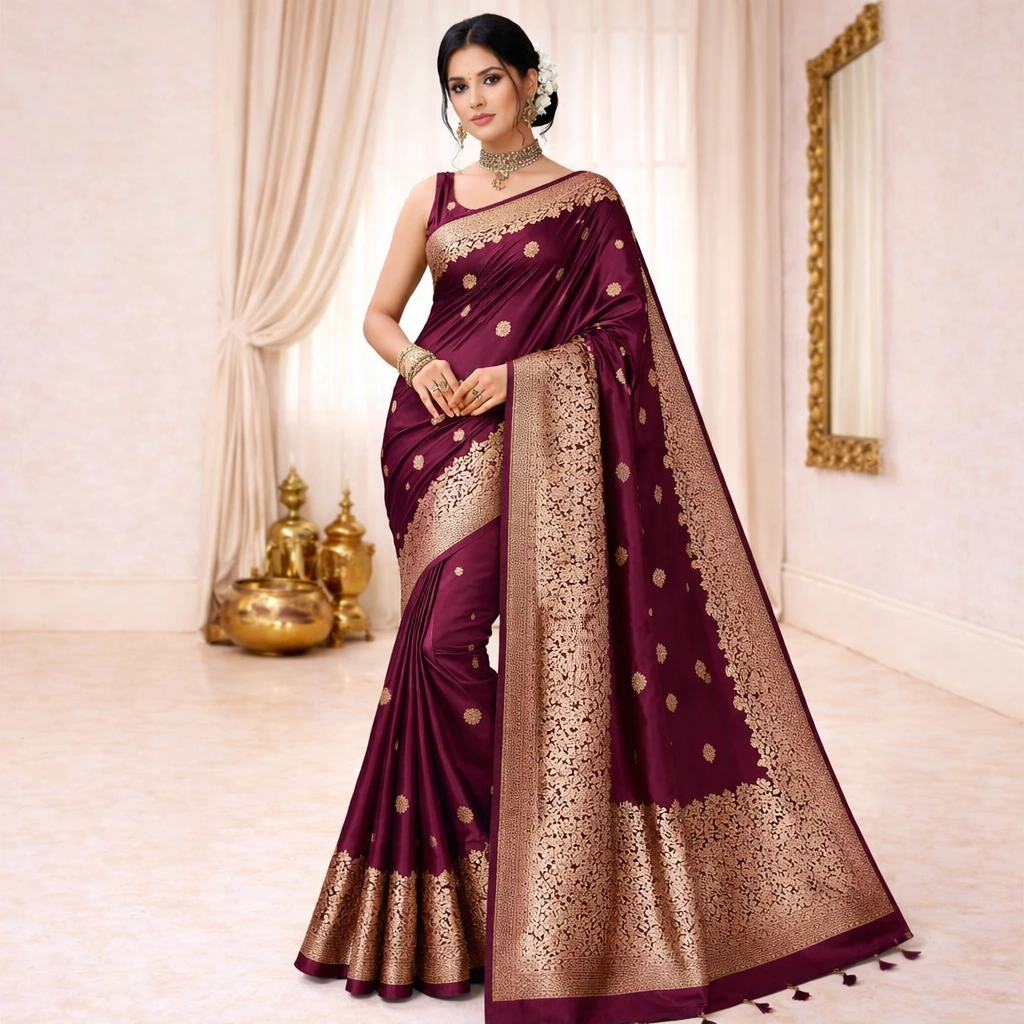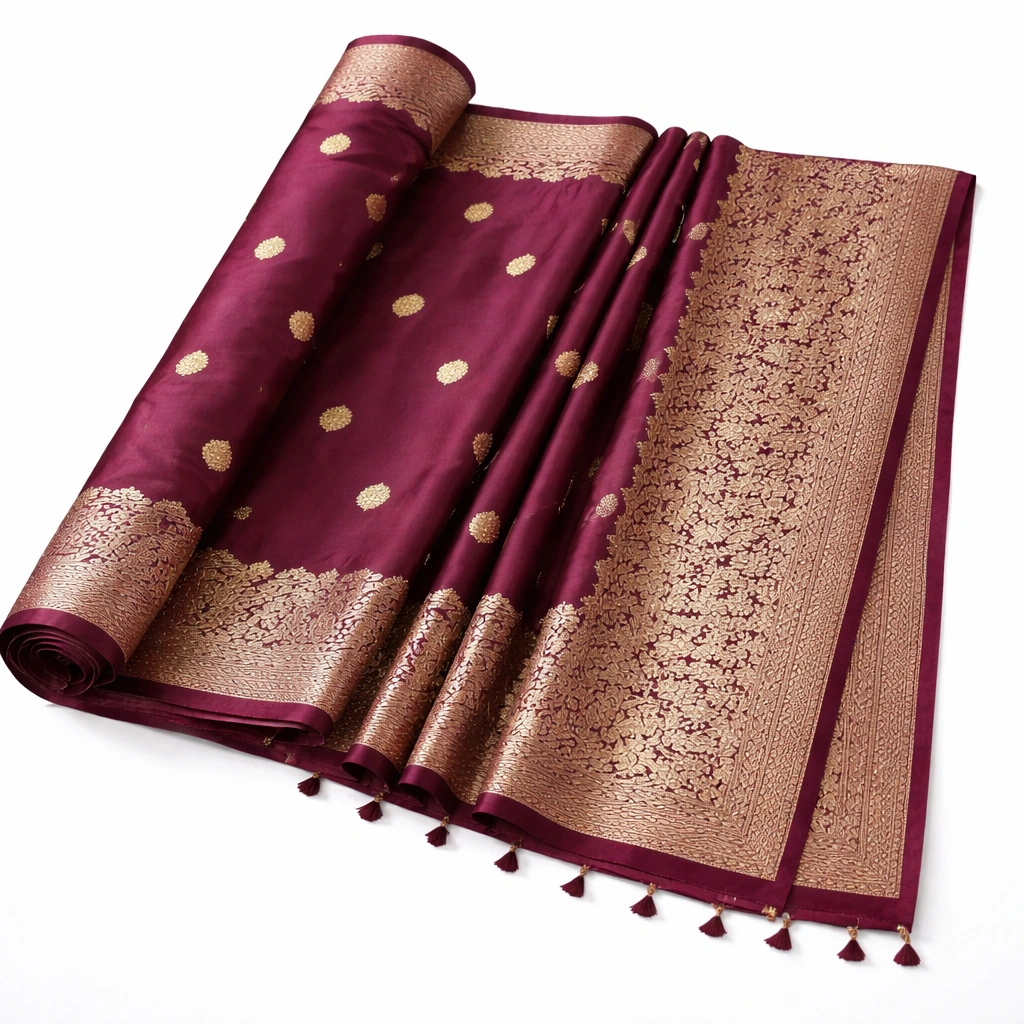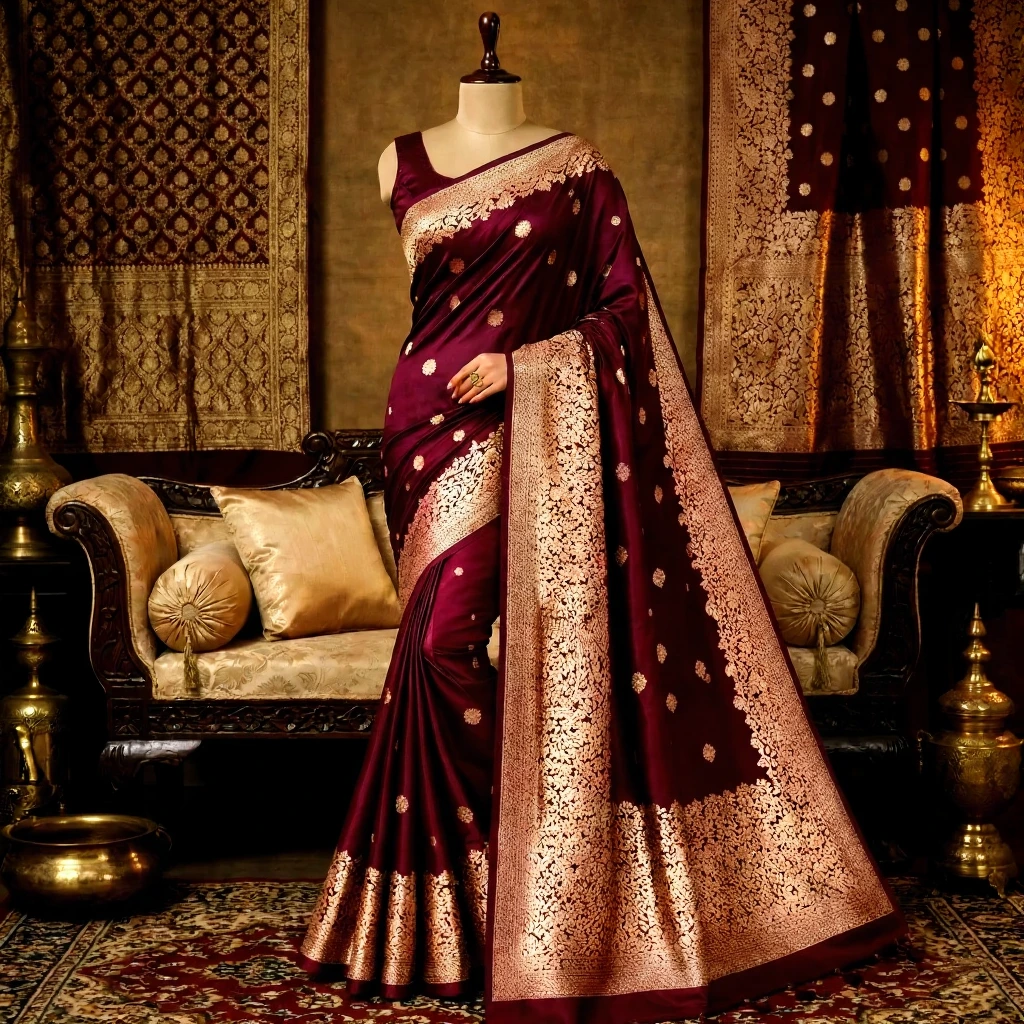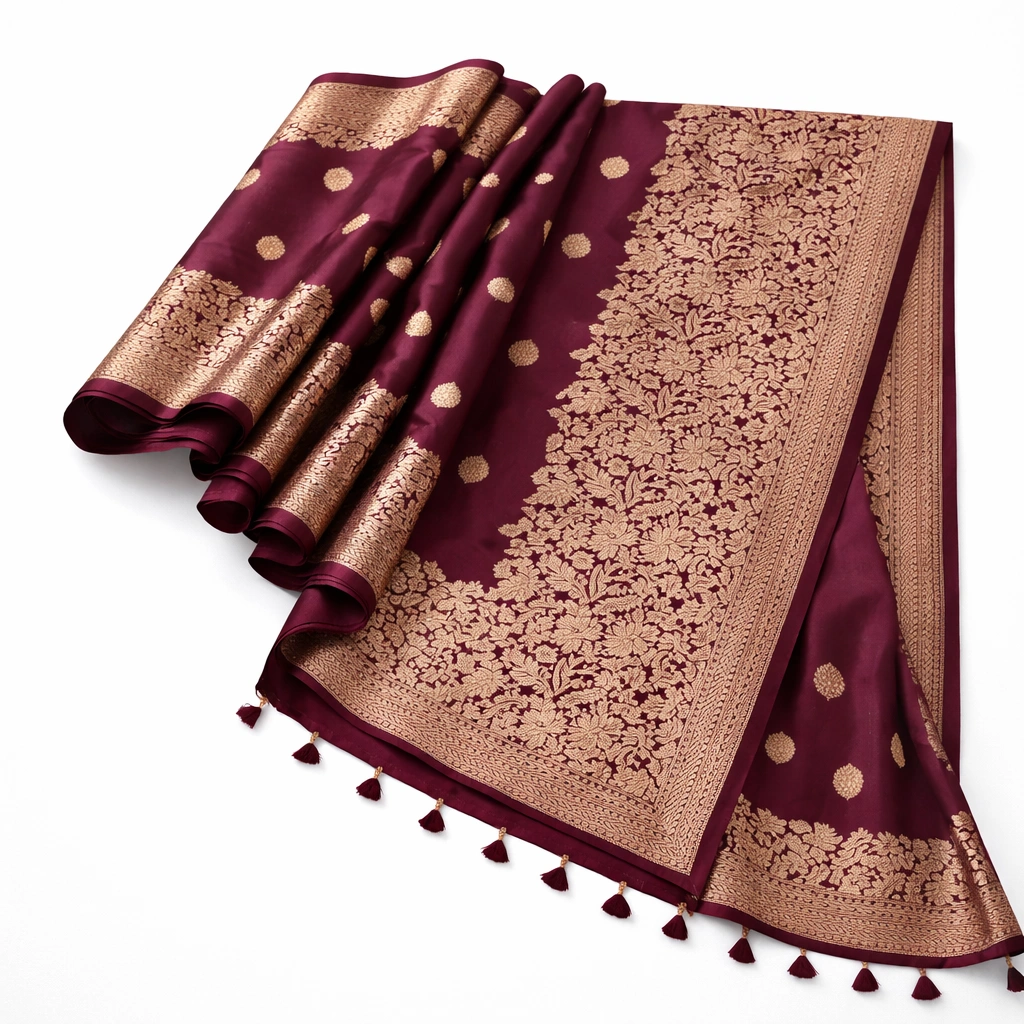Across the body, delicate woven zari butta motifs add subtle shimmer without overpowering the wine base. The contrast between deep maroon silk and antique gold zari delivers a striking visual impact while maintaining elegance.