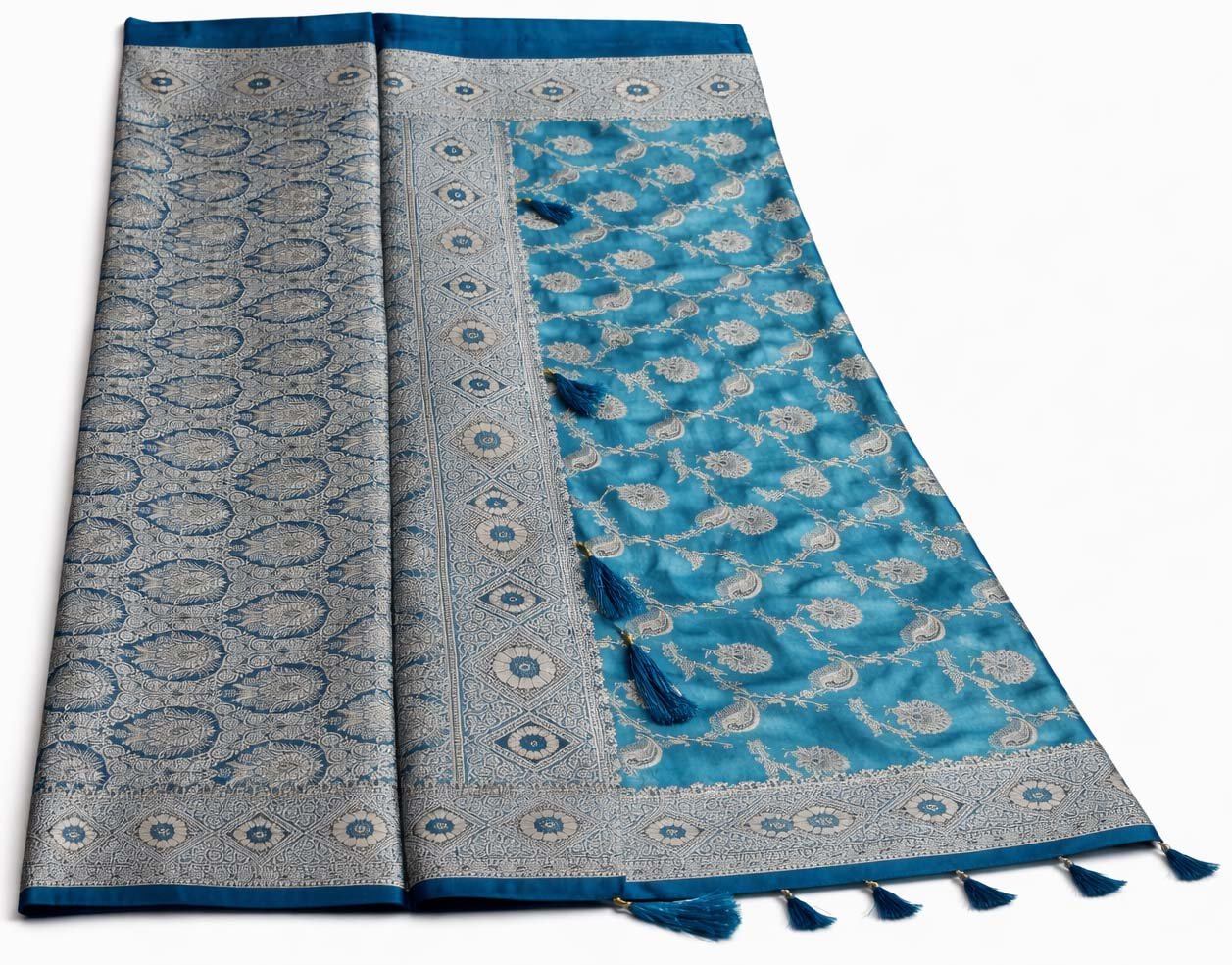 Peacock teal combined with copper zari is trending strongly this festive season. The Neelambara Shobha Satin Silk Saree is part of a limited collection and is selling steadily.