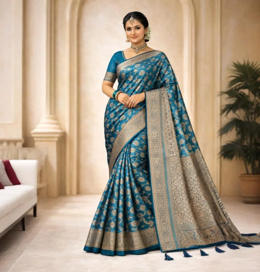 Its vibrant teal blue base radiates confidence. The detailed copper weaving adds warmth and depth, creating a striking yet sophisticated visual balance. When you drape the Neelambara Shobha Satin Silk Saree, the silhouette flows effortlessly, enhancing your natural grace.