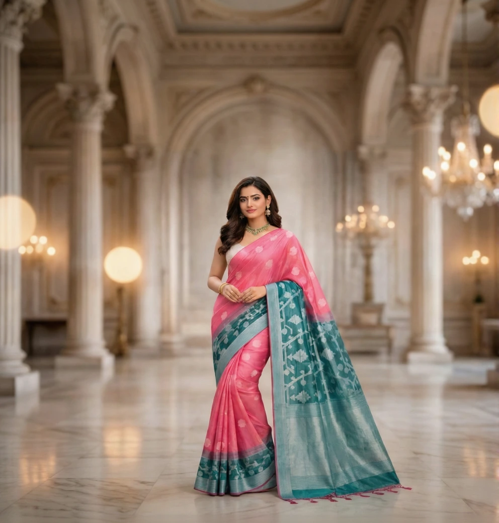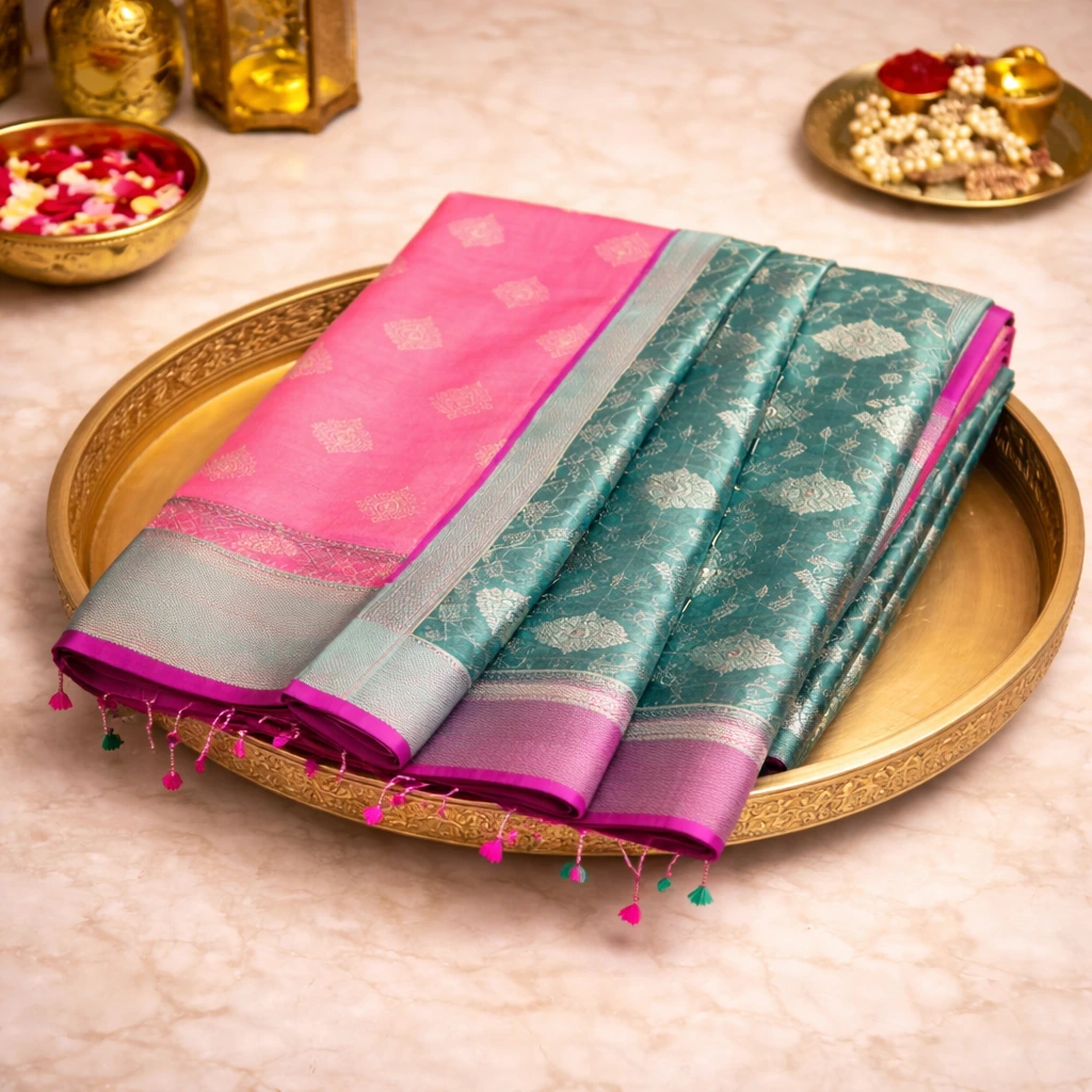 The delicate Rose Pink body radiates softness and femininity, while the Deep Teal Green pallu introduces depth and contrast. Together, they create a refined colour story that works beautifully for both casual elegance and festive sophistication.