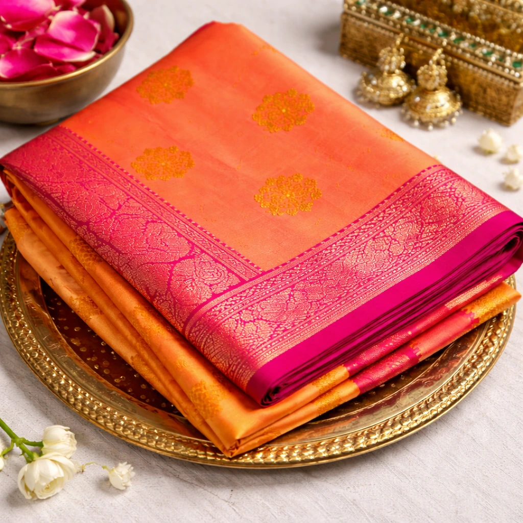 The coral peach body, enriched with deep Rani Pink undertones, is beautifully adorned with antique gold zari butta motifs. Complementing the body is a radiant sunlit mustard yellow contrast pallu, intricately woven with zari detailing. The Swarna Pushpa Soft Silk Saree captures festive richness while maintaining timeless elegance.