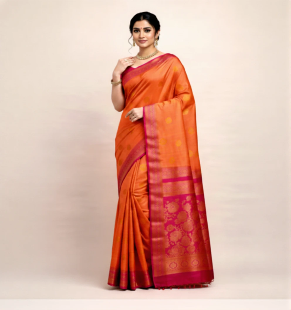 The interplay between coral peach and warm mango gold creates visual harmony, while the antique gold zari adds regal charm. The texture allows effortless draping and structured pleats, making it both comfortable and refined.